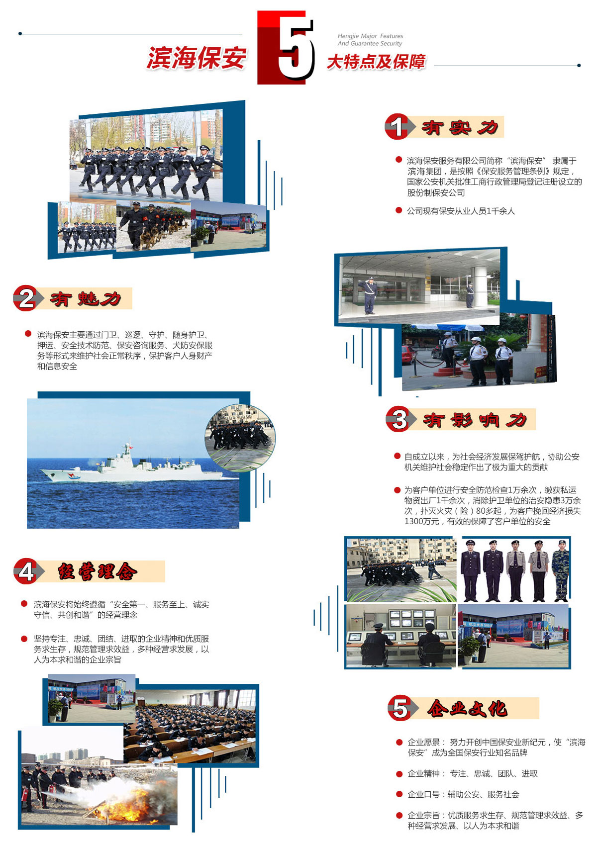 濱海保安主要通過門衛(wèi)、巡邏、守護、隨身護衛(wèi)、押運、安全技術(shù)防范、保安咨詢服務(wù)、犬防安保服務(wù)等形式來維護社會正常秩序,保護客戶人身財產(chǎn)和信息安全。公司現(xiàn)有保安從業(yè)人員1千余人,客戶單位涵蓋黨政機關(guān)、企事業(yè)單位、金融機構(gòu)、高檔寫字樓、賓館飯店、高檔別墅、高等院校、大型商場、建筑行業(yè)等,現(xiàn)有單位100余家。